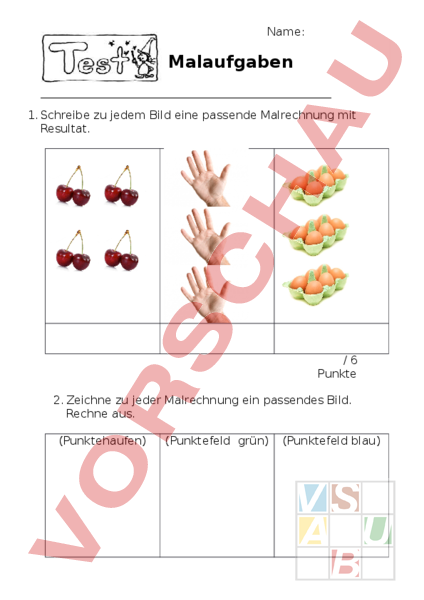 Name: Malaufgaben 1. Schreibe zu jedem Bild eine passende Malrechnung mit Resultat. /6 Punkte 2. Zeichne zu jeder Malrechnung ein passendes Bild. Rechne aus. (Punktehaufen) (Punktefeld grün) (Punktefeld blau) 34 42 23 3. Rechne aus und schreibe die passende Malrechnung dazu. 2222 666 /6 Punkte 4 4 4 4 4 33333 /8 Punkte 4. Umkreise und schreibe die passende Malrechnung mit Resultat. waagerecht (grün) senkrecht (blau) /8 Punkte 5. Schreibe die Malrechnung (grün) und die Umkehrung (blau). /6 Punkte Note: Datum: Unterschrift: /34 Punkte