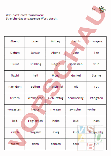 Zeit Was passt nicht zusammen? Streiche das unpassende Wort durch. Abend Essen Mittag nachts morgens Datum Januar Abend Jahr Tag Blume Frühling Regen spriessen früh Nacht hell Mond dunkel Sterne nachdem selten manchmal oft rot Ostern Weihnacht Geburtstag Sommertag Pfingsten vorgestern heute morgen zwischen kalt regnerisch heiss laut nass rasch langsam ewig kurz langweilig zuerst dann danach bald gut vorher