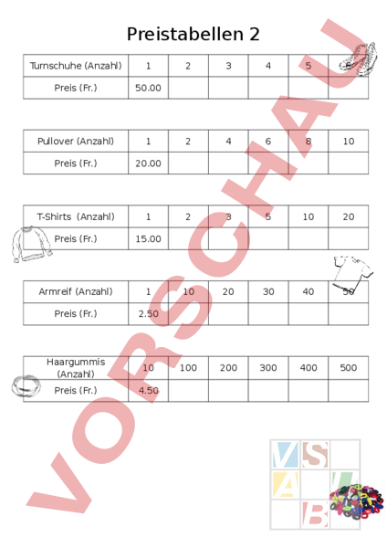 Preistabellen 2 Turnschuhe (Anzahl) 1 Preis (Fr.) 50.00 Pullover (Anzahl) 1 Preis (Fr.) 20.00 T-Shirts (Anzahl) 1 Preis (Fr.) 15.00 Armreif (Anzahl) 1 Preis (Fr.) 2.50 Haargummis (Anzahl) 10 Preis (Fr.) 4.50 2 3 4 5 6 2 4 6 8 10 2 3 5 10 20 10 20 30 40 50 100 200 300 400 500