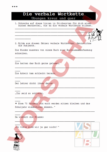 Die verbale Wortkette Übungen kreuz und quer 1. Schreibe auf diese Linien in Stichworten für dich einen kurzen Merkzettel, wie du die verbale Wortkette bildest. 2. Bilde aus diesen Sätzen verbale Wortketten. Kennzeichne die Subjekte. Die Kinder mussten von einem Buch eine Buchzusammenfassung schreiben. Sie hatten das Buch gerne gelesen. Die Arbeit kam schlecht heraus. Der Lehrer droht ihnen darum: „Ihr seid so schlecht. Etwa 70 Prozent von euch werden sitzen bleiben und das Schuljahr wiederholen müssen. Da wiehert die Klasse: „So viele sind wir ja gar nicht! Mache aus diesen verbalen Wortketten ganze Sätze. Am Schluss sollte es einen Witz geben. Achte also darauf, dass die Sätze einen Sinn ergeben. zu Fritzli sagen // die Mutter sich schon viel besser anhören // dein Husten da antworten // der Kleine ja auch Tag und Nacht üben // ich 3. Unterstreiche im folgenden Text die Verben und setze sie in den Infinitiv. Der Arzt fragt seinen angeschlagenen Patienten: Hat man wenigstens über Ihr blaues Auge gleich kalte Umschläge gemacht? Etwas beleidigt antwortet der Mann: Nein, aber dumme Witze wurden gerissen. 4. Unterstreiche die Subjekte doppelt. Susi möchte sich neu in der Bibliothek einschreiben lassen. Die Angestellte fragt: „Wie alt bist du? Die Antwort des Mädchens lautet: „Zehn! Die Bibliothekarin ist neugierig. Sie möchte erfahren, welche Interessen Susi hat. Deshalb fragt sie Susi: „Und was möchtest du werden? Da kommt blitzschnell die Antwort: „Elf!