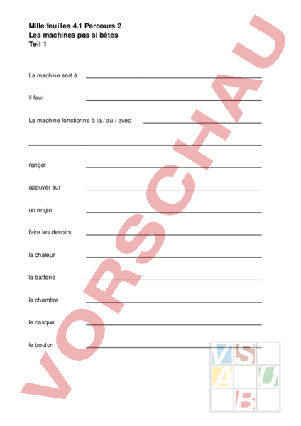 Mille feuilles 4.1 Parcours 2 Les machines pas si bêtes Teil 1 La machine sert à Il faut La machine fonctionne à la au avec ranger appuyer sur un engin faire les devoirs la chaleur la batterie la chambre le casque le bouton
