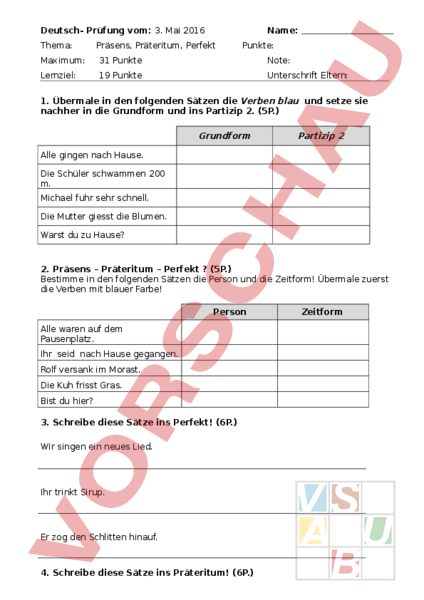 Deutsch- Prüfung vom: 3. Mai 2016 Thema: Name: Präsens, Präteritum, Perfekt Punkte: Maximum: 31 Punkte Note: Lernziel: 19 Punkte Unterschrift Eltern: 1. Übermale in den folgenden Sätzen die Verben blau und setze sie nachher in die Grundform und ins Partizip 2. (5P.) Grundform Partizip 2 Alle gingen nach Hause. Die Schüler schwammen 200 m. Michael fuhr sehr schnell. Die Mutter giesst die Blumen. Warst du zu Hause? 2. Präsens – Präteritum – Perfekt (5P.) Bestimme in den folgenden Sätzen die Person und die Zeitform! Übermale zuerst die Verben mit blauer Farbe! Person Alle waren auf dem Pausenplatz. Ihr seid nach Hause gegangen. Rolf versank im Morast. Die Kuh frisst Gras. Bist du hier? 3. Schreibe diese Sätze ins Perfekt! (6P.) Wir singen ein neues Lied. Ihr trinkt Sirup. Er zog den Schlitten hinauf. 4. Schreibe diese Sätze ins Präteritum! (6P.) Zeitform Wir haben viele Rehe gesehen. Ich läute an der Haustüre. Wir braten die Würste auf dem Grill. 5. Fülle diese Tabelle fertig aus! (9P.) Grundform stehen Präsens Präteritum Perfekt ich sitze ich ich du du du sie fängt sie sie wir wir tranken wir ihr ihr ihr seid gegangen sie singen sie sie