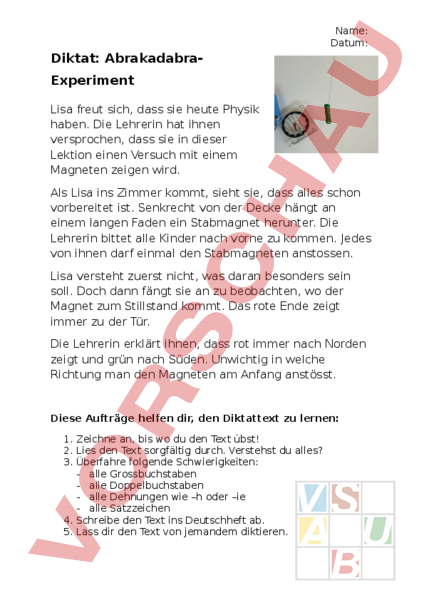 Name: Datum: Diktat: AbrakadabraExperiment Lisa freut sich, dass sie heute Physik haben. Die Lehrerin hat ihnen versprochen, dass sie in dieser Lektion einen Versuch mit einem Magneten zeigen wird. Als Lisa ins Zimmer kommt, sieht sie, dass alles schon vorbereitet ist. Senkrecht von der Decke hängt an einem langen Faden ein Stabmagnet herunter. Die Lehrerin bittet alle Kinder nach vorne zu kommen. Jedes von ihnen darf einmal den Stabmagneten anstossen. Lisa versteht zuerst nicht, was daran besonders sein soll. Doch dann fängt sie an zu beobachten, wo der Magnet zum Stillstand kommt. Das rote Ende zeigt immer zu der Tür. Die Lehrerin erklärt ihnen, dass rot immer nach Norden zeigt und grün nach Süden. Unwichtig in welche Richtung man den Magneten am Anfang anstösst. Diese Aufträge helfen dir, den Diktattext zu lernen: 1. Zeichne an, bis wo du den Text übst! 2. Lies den Text sorgfältig durch. Verstehst du alles? 3. Überfahre folgende Schwierigkeiten: alle Grossbuchstaben alle Doppelbuchstaben alle Dehnungen wie –h oder –ie alle Satzzeichen 4. Schreibe den Text ins Deutschheft ab. 5. Lass dir den Text von jemandem diktieren. Name: Datum: 6. Übe an einem anderen Tag die schwierigen Wörter nochmals und lass dir den Text immer wieder diktieren.