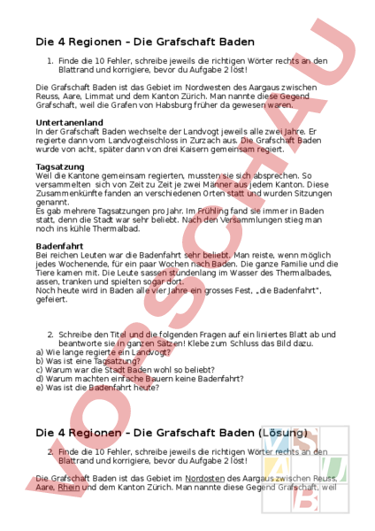 Die 4 Regionen – Die Grafschaft Baden 1. Finde die 10 Fehler, schreibe jeweils die richtigen Wörter rechts an den Blattrand und korrigiere, bevor du Aufgabe 2 löst! Die Grafschaft Baden ist das Gebiet im Nordwesten des Aargaus zwischen Reuss, Aare, Limmat und dem Kanton Zürich. Man nannte diese Gegend Grafschaft, weil die Grafen von Habsburg früher da gewesen waren. Untertanenland In der Grafschaft Baden wechselte der Landvogt jeweils alle zwei Jahre. Er regierte dann vom Landvogteischloss in Zurzach aus. Die Grafschaft Baden wurde von acht, später dann von drei Kaisern gemeinsam regiert. Tagsatzung Weil die Kantone gemeinsam regierten, mussten sie sich absprechen. So versammelten sich von Zeit zu Zeit je zwei Männer aus jedem Kanton. Diese Zusammenkünfte fanden an verschiedenen Orten statt und wurden Sitzungen genannt. Es gab mehrere Tagsatzungen pro Jahr. Im Frühling fand sie immer in Baden statt, denn die Stadt war sehr beliebt. Nach den Versammlungen stieg man noch ins kühle Thermalbad. Badenfahrt Bei reichen Leuten war die Badenfahrt sehr beliebt. Man reiste, wenn möglich jedes Wochenende, für ein paar Wochen nach Baden. Die ganze Familie und die Tiere kamen mit. Die Leute sassen stundenlang im Wasser des Thermalbades, assen, tranken und spielten sogar dort. Noch heute wird in Baden alle vier Jahre ein grosses Fest, „die Badenfahrt, gefeiert. 2. Schreibe den Titel und die folgenden Fragen auf ein liniertes Blatt ab und beantworte sie in ganzen Sätzen! Klebe zum Schluss das Bild dazu. a) Wie lange regierte ein Landvogt? b) Was ist eine Tagsatzung? c) Warum war die Stadt Baden wohl so beliebt? d) Warum machten einfache Bauern keine Badenfahrt? e) Was ist die Badenfahrt heute? Die 4 Regionen – Die Grafschaft Baden (Lösung) 2. Finde die 10 Fehler, schreibe jeweils die richtigen Wörter rechts an den Blattrand und korrigiere, bevor du Aufgabe 2 löst! Die Grafschaft Baden ist das Gebiet im Nordosten des Aargaus zwischen Reuss, Aare, Rhein und dem Kanton Zürich. Man nannte diese Gegend Grafschaft, weil die Grafen von Habsburg früher da gewesen waren. Untertanenland In der Grafschaft Baden wechselte der Landvogt jeweils alle zwei Jahre. Er regierte dann vom Landvogteischloss in Baden aus. Die Grafschaft Baden wurde von acht, später dann von drei Kantonen gemeinsam regiert. Tagsatzung Weil die Kantone gemeinsam regierten, mussten sie sich absprechen. So versammelten sich von Zeit zu Zeit je zwei Männer aus jedem Kanton. Diese Zusammenkünfte fanden an verschiedenen Orten statt und wurden Tagsatzungen genannt. Es gab mehrere Tagsatzungen pro Jahr. Im Sommer fand sie immer in Baden statt, denn die Stadt war sehr beliebt. Nach den Versammlungen stieg man noch ins warme Thermalbad. Badenfahrt Bei reichen Leuten war die Badenfahrt sehr beliebt. Man reiste, wenn möglich jedes Jahr, für ein paar Wochen nach Baden. Die ganze Familie und die Diener kamen mit. Die Leute sassen stundenlang im Wasser des Thermalbades, assen, tranken und spielten sogar dort. Noch heute wird in Baden alle zehn Jahre ein grosses Fest, „die Badenfahrt, gefeiert. 2. Schreibe den Titel und die folgenden Fragen auf ein liniertes Blatt ab und beantworte sie in ganzen Sätzen! Klebe zum Schluss das Bild dazu. a) Wie lange regierte ein Landvogt? 2 Jahre b) Was ist eine Tagsatzung? Sitzung der Regierenden zur Absprache c) Warum war die Stadt Baden wohl so beliebt? Thermalbad d) Warum machten einfache Bauern keine Badenfahrt? Kein Geld e) Was ist die Badenfahrt heute? Grosses Fest alle zehn Jahre