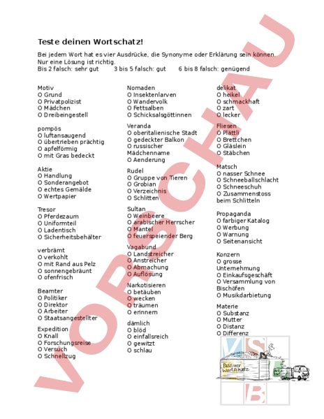 Teste deinen Wortschatz! Bei jedem Wort hat es vier Ausdrücke, die Synonyme oder Erklärung sein können. Nur eine Lösung ist richtig. Bis 2 falsch: sehr gut 3 bis 5 falsch: gut 6 bis 8 falsch: genügend Motiv Grund Privatpolizist Mädchen Dreibeingestell Nomaden Insektenlarven Wandervolk Fettsalben Schicksalsgöttinnen delikat heikel schmackhaft zart lecker pompös luftansaugend übertrieben prächtig apfelförmig mit Gras bedeckt Veranda oberitalienische Stadt gedeckter Balkon russischer Mädchenname Aenderung Fliesen Plättli Brettchen Gläslein Stäbchen Aktie Handlung Sonderangebot echtes Gemälde Wertpapier Rudel Gruppe von Tieren Grobian Verzeichnis Schlitten Tresor Pferdezaum Uniformteil Ladentisch Sicherheitsbehälter Sultan Weinbeere arabischer Herrscher Mantel feuerspeiender Berg verbrämt verkohlt mit Rand aus Pelz sonnengebräunt ofenfrisch Beamter Politiker Direktor Arbeiter Staatsangestellter Expedition Knall Forschungsreise Versuch Schnellzug Vagabund Landstreicher Anstreicher Abmachung Auflösung Narkotisieren betäuben wecken träumen erinnern dämlich blöd einfallsreich gewitzt schlau Matsch nasser Schnee Schneeballschlacht Schneeschuh Zusammenstoss beim Schlitteln Propaganda farbiger Katalog Werbung Warnung Seitenansicht Konzern grosse Unternehmung Einkaufsgeschäft Versammlung von Bischöfen Musikdarbietung Materie Substanz Mutter Distanz Differenz