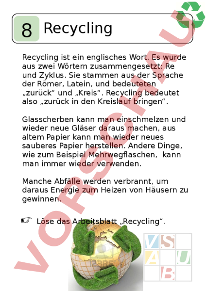 8 Recycling Recycling ist ein englisches Wort. Es wurde aus zwei Wörtern zusammengesetzt: Re und Zyklus. Sie stammen aus der Sprache der Römer, Latein, und bedeuteten „zurück und „Kreis. Recycling bedeutet also „zurück in den Kreislauf bringen. Glasscherben kann man einschmelzen und wieder neue Gläser daraus machen, aus altem Papier kann man wieder neues sauberes Papier herstellen. Andere Dinge, wie zum Beispiel Mehrwegflaschen, kann man immer wieder verwenden. Manche Abfälle werden verbrannt, um daraus Energie zum Heizen von Häusern zu gewinnen. Löse das Arbeitsblatt „Recycling.