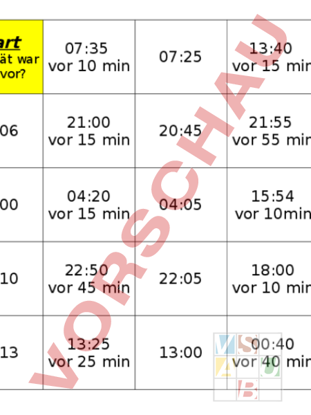 Start 07:35 vor 10 min 07:25 13:40 vor 15 min 13:25 20:18 vor 12 min 20:06 21:00 vor 15 min 20:45 21:55 vor 55 min 20:00 0:00 vor 60 min 23:00 04:20 vor 15 min 04:05 15:54 vor 10min 15:44 18:17 vor 7 min 18:10 22:50 vor 45 min 22:05 18:00 vor 10 min 17:50 04:33 vor 20 min 04:13 13:25 vor 25 min 13:00 00:40 vor 40 min 00:00 Ziel Wie spät war es davor?