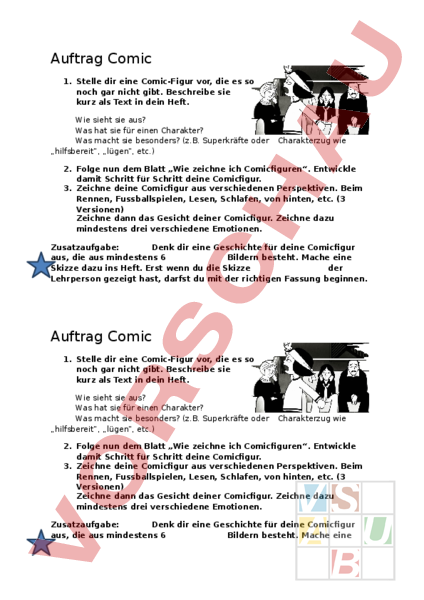 Auftrag Comic 1. Stelle dir eine Comic-Figur vor, die es so noch gar nicht gibt. Beschreibe sie kurz als Text in dein Heft. Wie sieht sie aus? Was hat sie für einen Charakter? Was macht sie besonders? (z.B. Superkräfte oder „hilfsbereit, „lügen, etc.) Charakterzug wie 2. Folge nun dem Blatt „Wie zeichne ich Comicfiguren. Entwickle damit Schritt für Schritt deine Comicfigur. 3. Zeichne deine Comicfigur aus verschiedenen Perspektiven. Beim Rennen, Fussballspielen, Lesen, Schlafen, von hinten, etc. (3 Versionen) Zeichne dann das Gesicht deiner Comicfigur. Zeichne dazu mindestens drei verschiedene Emotionen. Zusatzaufgabe: Denk dir eine Geschichte für deine Comicfigur aus, die aus mindestens 6 Bildern besteht. Mache eine Skizze dazu ins Heft. Erst wenn du die Skizze der Lehrperson gezeigt hast, darfst du mit der richtigen Fassung beginnen. Auftrag Comic 1. Stelle dir eine Comic-Figur vor, die es so noch gar nicht gibt. Beschreibe sie kurz als Text in dein Heft. Wie sieht sie aus? Was hat sie für einen Charakter? Was macht sie besonders? (z.B. Superkräfte oder „hilfsbereit, „lügen, etc.) Charakterzug wie 2. Folge nun dem Blatt „Wie zeichne ich Comicfiguren. Entwickle damit Schritt für Schritt deine Comicfigur. 3. Zeichne deine Comicfigur aus verschiedenen Perspektiven. Beim Rennen, Fussballspielen, Lesen, Schlafen, von hinten, etc. (3 Versionen) Zeichne dann das Gesicht deiner Comicfigur. Zeichne dazu mindestens drei verschiedene Emotionen. Zusatzaufgabe: Denk dir eine Geschichte für deine Comicfigur aus, die aus mindestens 6 Bildern besteht. Mache eine Skizze dazu ins Heft. Erst wenn du die Skizze der Lehrperson gezeigt hast, darfst du mit der richtigen Fassung beginnen