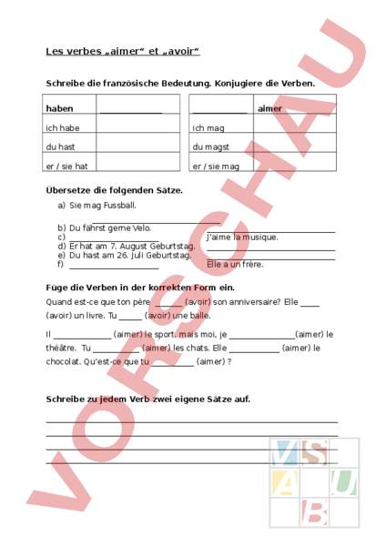Les verbes „aimer et „avoir Schreibe die französische Bedeutung. Konjugiere die Verben. haben ich habe ich mag du hast du magst er sie hat er sie mag aimer Übersetze die folgenden Sätze. a) Sie mag Fussball. b) c) d) e) f) Du fährst gerne Velo. Jaime la musique. Er hat am 7. August Geburtstag. Du hast am 26. Juli Geburtstag. Elle un frère. Füge die Verben in der korrekten Form ein. Quand est-ce que ton père (avoir) son anniversaire? Elle (avoir) un livre. Tu (avoir) une balle. Il (aimer) le sport, mais moi, je(aimer) le théâtre. Tu (aimer) les chats. Elle (aimer) le chocolat. Quest-ce que tu (aimer) Schreibe zu jedem Verb zwei eigene Sätze auf.