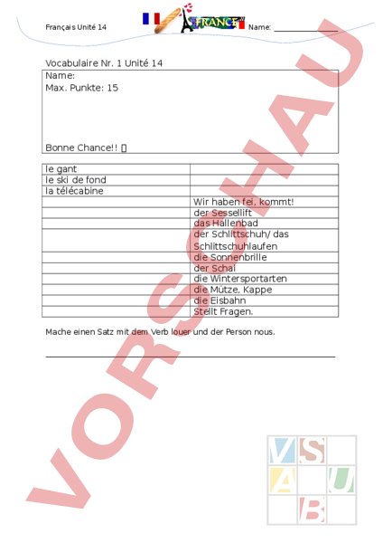 Français Unité 14 Name: Vocabulaire Nr. 1 Unité 14 Name: Max. Punkte: 15 Bonne Chance!! le gant le ski de fond la télécabine Wir haben fei, kommt! der Sessellift das Hallenbad der Schlittschuh/ das Schlittschuhlaufen die Sonnenbrille der Schal die Wintersportarten die Mütze, Kappe die Eisbahn Stellt Fragen. Mache einen Satz mit dem Verb louer und der Person nous.