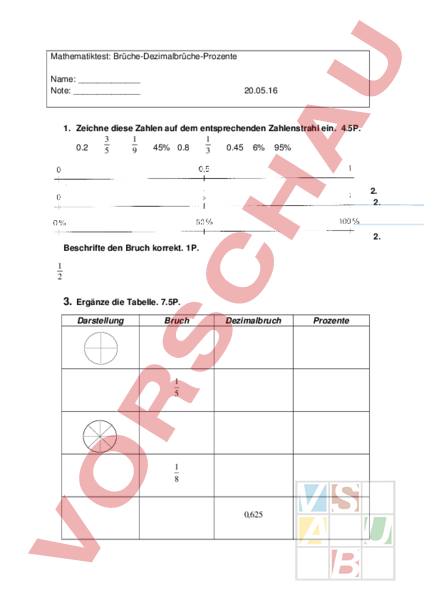 Mathematiktest: BrücheDezimalbrücheProzente Name: Note: 20.05.16 1. Zeichne diese Zahlen auf dem entsprechenden Zahlenstrahl ein. 4.5P. 3 1 1 0.2 45% 0.8 0.45 6% 95% 5 9 3 2. 2. 2. Beschrifte den Bruch korrekt. 1P. 1 2 3. Ergänze die Tabelle. 7.5P. Darstellung Bruch Dezimalbruch 1 5 1 8 0,625 Prozente 4. Ergänze die fehlenden Angaben. 3P. 5. Brüche addieren oder subtrahieren. 6P. 6. Vergleiche die beiden Brüche. 1.5P. 86 98 5 3 11 9 23 57