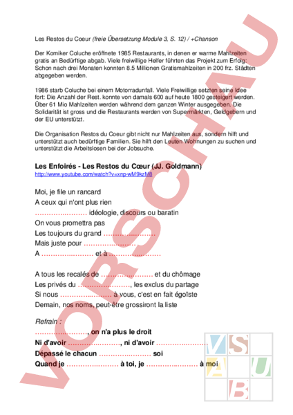 Les Restos du Coeur (freie Übersetzung Module 3, S. 12) Chanson Der Komiker Coluche eröffnete 1985 Restaurants, in denen er warme Mahlzeiten gratis an Bedürftige abgab. Viele freiwillige Helfer führten das Projekt zum Erfolg: Schon nach drei Monaten konnten 8.5 Millionen Gratismahlzeiten in 200 frz. Städten abgegeben werden. 1986 starb Coluche bei einem Motorradunfall. Viele Freiwillige setzten seine Idee fort: Die Anzahl der Rest. konnte von damals 600 auf heute 1800 gesteigert werden. Über 61 Mio Mahlzeiten werden während dem ganzen Winter ausgegeben. Die Solidarität ist gross und die Restaurants werden von Supermärkten, Geldgebern und der EU unterstützt. Die Organisation Restos du Coeur gibt nicht nur Mahlzeiten aus, sondern hilft und unterstützt auch bedürftige Familien. Sie hilft den Leuten Wohnungen zu suchen und unterstützt die Arbeitslosen bei der Jobsuche. Les Enfoirés Les Restos du Cœur (JJ. Goldmann) Moi, je file un rancard ceux qui nont plus rien idéologie, discours ou baratin On vous promettra pas Les toujours du grand Mais juste pour et à tous les recalés de et du chômage Les privés du , les exclus du partage Si nous à vous, cest en fait égoïste Demain, nos noms, peutêtre grossiront la liste Refrain , on na plus le droit Ni davoir , ni davoir Dépassé le chacun soi Quand je à toi, je à moi Je te promets pas le grand Mais juste à et à Un de et de Dans les restos, les restos du cœur , on na plus le droit Ni davoir , ni davoir Autrefois on gardait une place à Une soupe, une , un coin sans létable Aujourdhui nos paupières et nos sont closes Les autres toujours, toujours en overdose Jai pas mauvaise conscience Ça mempêche pas d Mais pour tout Ça gâche un peu le goût dmes plaisirs Cest pas vraiment de ma Si yen qui ont Mais ça le deviendrait Si on ny rien Refrain Jai pas de solution pour te la Mais si je taider quelques , allonsy a bien dautres misères, trop pour un inventaire Mais ça se ici, ici et aujourdhui Refrain solution Les Enfoirés Les Restos du Cœur (JJ. Goldmann) Moi, je file un rancard ceux qui nont plus rien Sans idéologie, discours ou baratin On vous promettra pas Les toujours du grand soir Mais juste pour lhiver manger et à boire tous les recalés de lâge et du chômage Les privés du gâteau, les exclus du partage Si nous pensons à vous, cest en fait égoïste Demain, nos noms, peutêtre grossiront la liste Refrain Aujourdhui, on na plus le droit Ni davoir faim, ni davoir froid Dépassé le chacun pour soi Quand je pense à toi, je pense à moi Je te promets pas le grand soir Mais juste à manger et à boire Un peu de pain et de chaleur Dans les restos, les restos du cœur Aujourdhui, on na plus le droit Ni davoir faim, ni davoir froid Autrefois on gardait toujours une place à table Une soupe, une chaise, un coin sans létable Aujourdhui nos paupières et nos portes sont closes Les autres sont toujours, toujours en overdose Jai pas mauvaise conscience Ça mempêche pas d dormir Mais pour tout dire Ça gâche un peu le goût dmes plaisirs Cest pas vraiment de ma faute Si yen qui ont faim Mais ça le deviendrait Si on ny change rien Refrain Jai pas de solution pour te changer la vie Mais si je peux taider quelques heures, allonsy a bien dautres misères, trop pour un inventaire Mais ça se passe ici, ici et aujourdhui Refrain