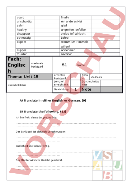 court finally unschuldig ein anderes Mal zahm glad healthy angreifen, anfallen disappear vieles lief schlecht schmutzig Lehre expect Warum um Himmels supper willen? annehmen murder nachher Fach: Englisc maximale Punktzahl Thema: Unit 15 Unterschrift Eltern 51 Name erreichte Punktzahl Lernziel erreicht mit Gewichtung Datu 20.05.16 Durchschnitts note 1 Note A) Translate in either English or German. (9) B) Translate the following. (12) Ich bin froh, dasss du gesund bist. Der Schlüssel ist plötzlich verschwunden Endlich ist die Schule fertig. Der Mörder wird vor Gericht geschickt. Ich erwarte, dass du eine Lehre machst. Geh nicht ins Haus. Du bist ganz schmutzig. C) Grammar: Transform the sentences into Conditional 3. (8) D) Grammar: Write the sentences again ------------------------------------------------------------------------------using the past participle.(9) ------------------------------------------------------------------------------------------------------------------------------------------------------------If they We bet you this. ------------------------------------------------------------------------------(not 1. understand) thecant do ------------------------------------------------------------------------------2. bite you. exercise, Mrs Wells --------------------------------------------------------------------- 3. They break window. e.g They have broken the window 4. (explain) bringita cake. again. 5. The house burns down. 6. She catches the bus. 7. He chooses to stay there. ------------------------------------------------------------------------------8. You do your best. ------------------------------------------------------------------------------------------------------------------------------------------------------------9. We drink our coffee. ------------------------------------------------------------------------------10. She drives him to ------------------------------------------------------------------------------school. James (not cry) if the doctor (not give) him an injection. If (save) some money, (go) to the beach on holiday. ---------------------------------------------------------------------- E) Australia: Explain the following words in English: (15) ------------------------------------------------------------------------------------------------------------------------------------------------------------pouch: ---------------------------------------------------------------------------------------------------------------------------------------------------------------------------------------------------------------------------------------------------------------------------------------------------------------- ------------------------------------------------------------------------------------------------------------------------------------------------------------------------------------------------------------------------------------------------------------------------------------------------------------------------------------------------------------------------------------------------------- If they (get) up earlier, they (not miss) the school bus. wallabies: to cling: frequent: cuddly: marsupial: dot: 1. This is cute animal that looks like small bear. 2. An Australian Music Instrument. 3. If you throw it properly it comes back to you. 4. The most common tree in Australia. 5. This animal hops on its hind legs. 6. The indigenous Australians. 7. Melbourne is the capital city of 8. The capital city of NSW