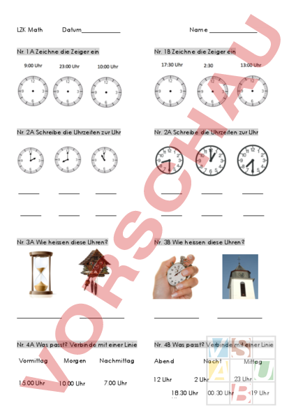 LZK Math Datum_ Name Nr. 1A Zeichne die Zeiger ein Nr. 1B Zeichne die Zeiger ein Nr. 2A Schreibe die Uhrzeiten zur Uhr Nr. 2A Schreibe die Uhrzeiten zur Uhr Nr. 3A Wie heissen diese Uhren? Nr. 3B Wie heissen diese Uhren? Nr. 4A Was passt? Verbinde mit einer Linie Vormittag 15.00 Uhr Morgen 10.00 Uhr Nachmittag 7.00 Uhr Nr. 4B Was passt? Verbinde mit einer Linie Abend 12 Uhr Nacht 2 Uhr 18.30 Uhr Uhr 00.30 Uhr Uhr Mittag 23 Uhr 19 Uhr