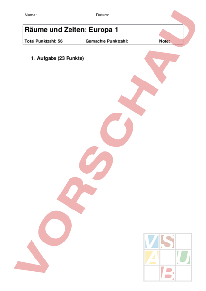 Name: Datum: Räume und Zeiten: Europa 1 Total Punktzahl: 56 1. Aufgabe (23 Punkte) Gemachte Punktzahl: Note: Name: Datum: Bestimme 23 Länder und die dazugehörigen Hauptstädte, setzte die Zahl des Landes am richtigen Ort in die Karte. Nummer Land Hauptstadt Name: Datum: 1 2 3 4 5 6 7 8 9 10 11 12 13 14 15 16 17 18 19 20 21 22 23 2. Aufgabe (10 Punkte) Zeichne in der Europakarte unten grob die sechs „Klimazonen mit verschiedenen Farben ein und benenne diese! Schreibe mit der Farbe, mit welcher du das Klima malst. Name: Datum: 1: 2: 3: 4: 5: 6: 3. Aufgabe (15 Punkte) Ordne folgende Klimadiagramme den vorgegebenen Städten zu, benenne das Klima genau und gebe je mindestens drei erläuternde Stichworte zu den Klimazonen! 1 Name: Datum: 2 3 Athen (Griechenland): Klimazone: Zürich (Schweiz): Klimazone: Murmansk (Russland); Klimazone: Klimadiagramm 1: Klimazone Klimadiagramm 2: Klimazone Name: Datum: Klimadiagramm 3: Klimazone 4. Aufgabe (6 Punkte) Beantworte die Frage mit ganzen Sätzen. Frage 1: Warum ist es im Osten kälter als im Westen? Frage 2: Warum regnet es an den Küsten viel? Frage 3: Warum regnet es bei Gebirgen viel? Frage 4: Was weisst du über die Niederschlagsmenge im Norden und im Süden Europas? Frage 5: Warum gefriert die Ostsee im Winter oft zu und der Atlantik nicht? Frage 6: Warum sollte man im Westen von London leben? Name: Datum: Gutes Gelingen!