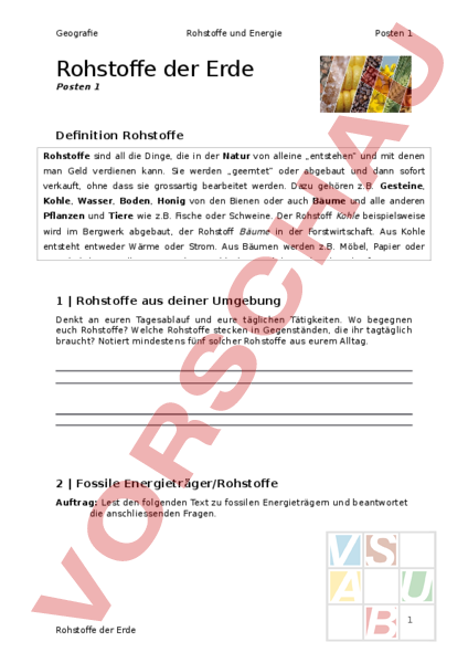 Arbeitsblatt: Rohstoffe und Energie - Stationenarbeiten Posten 1