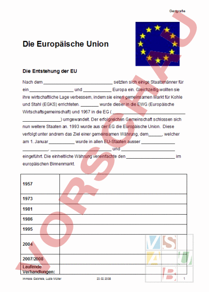 Geografie Die Europäische Union Die Entstehung der EU Nach dem setzten sich einige Staatsmänner für ein und Europa ein. Gleichzeitig wollten sie ihre wirtschaftliche Lage verbessern, indem sie einen gemeinsamen Markt für Kohle und Stahl (EGKS) errichteten. wurde dieser in die EWG (Europäische Wirtschaftsgemeinschaft) und 1967 in die EG ) umgewandelt. Der erfolgreichen Gemeinschaft schlossen sich nun weitere Staaten an. 1993 wurde aus der EG die Europäische Union. Diese verfolgt unter andrem das Ziel einer gemeinsamen Währung, dem am 1. Januar welcher wurde in allen EU-Staaten ausser und eingeführt. Die einheitliche Währung vereinfachte den im europäischen Binnenmarkt. 1957 1973 1981 1986 1995 2004 2007/2008 Laufende Verhandlungen: Immoos Gabriela, Luzia Müller 23.02.2008 1 Geografie Europa heute Der europäische Binnenmarkt Grundfreiheit Beispiel A: Matti K. aus Finnland besitzt ein Ferienhaus in Griechenland und eröffnet dort ein Bankkonto. Weil er es in Euro führt, sind Geldeinlagen bis zu einer bestimmten Höhe gesichert. B: Beate Z. aus Deutschland kauft ein Auto direkt in Frankreich. Dafür bezahlt sie bei der Einfuhr nach Deutschland keine Zollgebühren. Die obligatorische Haftpflichtversicherung schliesst sie in einem EU-Land ihrer Wahl ab. Immoos Gabriela, Luzia Müller 23.02.2008 2 Geografie C: Karin M. aus Österreich ist arbeitslos und interessiert sich für Italien. Sie informiert sich beim europäischen Netzwerk über freie Stellen. Es ist ihr erlaubt, ohne Formalitäten für drei Monate in Italien zu weilen, um auf Stellensuche zu gehen. Dort hat sie Anspruch auf gleiche Hilfe wie inländische Arbeitnehmer. D: Joop V. aus Holland transportiert oft Güter nach Spanien. Um nicht immer mit leerem Lastwagen zurückzufahren, bietet er seine Transportdienste auch in Spanien an. Schweiz – EU: Die Bilateralen Abkommen Die ersten bilateralen Verträge zwischen der Schweiz und der EU traten 2002 in Kraft. 1 Mehr Freiheit in der Arbeitsplatz- und Stellenwahl; Einreise in ein anderes Land mit beruflicher Tätigkeit 2 Gegenseitige Anerkennung von technischen Zertifikaten, um Verkauf von Maschinen und Geräten zu erleichtern 3 Gegenseitige Öffnung bei der Vergabe von öffentlichen Aufträgen 4 Koordination der europäischen Verkehrspolitik unter Berücksichtigung des Alpenraums 5 (Fast) freier Zugang der Schweizer Fluggesellschaften zum EU-Raum und umgekehrt 6 Gegenseitige Marktöffnung für landwirtschaftliche Produkte 7 Freier Zutritt zu allen europäischen Forschungsprojekten Immoos Gabriela, Luzia Müller 23.02.2008 3 Geografie Die zweiten bilateralen Verträge wurden von den Bundesräten Deiss und Calmy-Rey unterschrieben. Sie treten nach und nach in Kraft. 1 Zinsbesteuerung: Grenzüberschreitende Besteuerung von Zinserträgen 2 Betrugsbekämpfung: Verstärkte Zusammenarbeit gegen Delikte im Bereich indirekter Steuern 3 Schengen/Dublin: Erleichterter Reiseverkehr, Gewährleistung der inneren Sicherheit, Entlastung des Asylwesens, Stärkung des Asylrechts 4 Verarbeitete Landwirtschaftsprodukte: Abbau der Zölle und Exportsubventionen auf Produkte der Nahrungsmittelindustrie 5 Umwelt: Teilnahme an der Europäischen Umweltagentur (EUA); umweltpolitische Zusammenarbeit 6 Statistik: Zusammenarbeit mit Statistischem Amt der EU (EUROSTAT); sammelt, analysiert, publiziert Daten 7 Bildung, Berufsbildung, Jugend: Teilnahme an EU-Bildungsprogrammen, Sokrates, Erasmus, Leonardo da Vinci, 8 Media-Programme: Förderung des europäischen Films 9 Ruhegehälter: Aufhebung der Doppelbesteuerung von pensionierten EU-Beamten Immoos Gabriela, Luzia Müller 23.02.2008 4