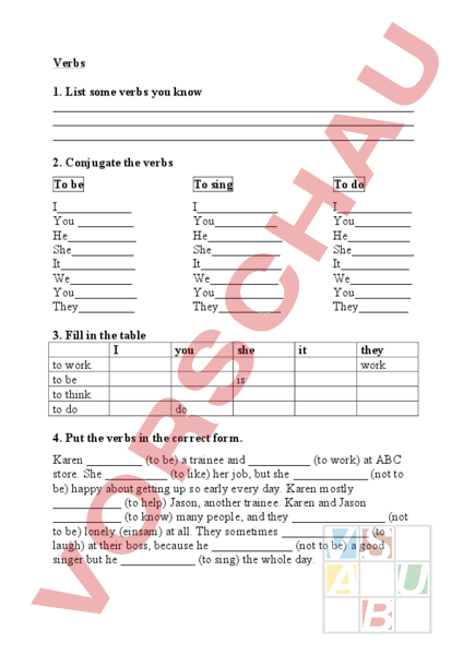 Verbs 1. List some verbs you know 2. Conjugate the verbs To be To sing To do I You He_ She It We You They_ I_ You He She_ It_ We_ You_ They I You_ He She It_ We You_ They 3. Fill in the table to work to be to think to do you she it they work is do 4. Put the verbs in the correct form. Karen (to be) trainee and (to work) at ABC store. She (to like) her job, but she (not to be) happy about getting up so early every day. Karen mostly (to help) Jason, another trainee. Karen and Jason (to know) many people, and they (not to be) lonely (einsam) at all. They sometimes (to laugh) at their boss, because he (not to be) good singer but he (to sing) the whole day.