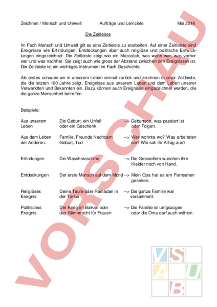 Zeichnen Mensch und Umwelt Aufträge und Lernziele Mai 2016 Die Zeitleiste Im Fach Mensch und Umwelt gilt es eine Zeitleiste zu erarbeiten. Auf einer Zeitleiste sind Ereignisse wie Erfindungen, Entdeckungen aber auch religiöse und politische Entwick lungen eingezeichnet. Die Zeitleiste zeigt wie ein Massstab, was wann war, was vorher war und was nachher. Sie zeigt auch wie gross der Abstand zwischen den Ereignissen ist. Die Zeitleiste ist ein wichtiges Instrument im Fach Geschichte. Als erstes schauen wir in unserem Leben einmal zurück und zeichnen in einer Zeitleiste, die die letzten 100 Jahre zeigt, Ereignisse aus unserem Leben und dem Leben unserer Verwandten und Bekannten ein. Dazu können auch Ereignisse eingezeichnet werden, die die ganze Menschheit betreffen. Beispiele: Aus unserem Leben Die Geburt, ein Unfall oder ein Geschenk Geburtsort, was passiert ist oder Folgen. Aus dem Leben der Anderen. Familie, Freunde Nachbarn Geburt, Tod Wer wohnte wo? Was arbeiteten sie? Wie sah ihr Alltag aus? Erfindungen Die Waschmaschine Die Grosseltern wuschen ihre Kleider noch von Hand. Entdeckungen Der erste Mensch auf dem Mond Mein Opa hat es am Fernsehen gesehen. Religiöses Ereignis Deine Taufe oder Ramadan in der Türkei Die ganze Familie war versammelt. Politisches Ereignis Der Krieg im Balkan oder das Stimmrecht für Frauen Die Familie ist umgezogen oder die Oma darf auch wählen. Auftrag Nimm zwei Zeitleisten und klebe sie zusammen. Fülle die Liste der Ereignisse mit den Ideen ein, die in deine Zeitleiste passen. Zu jedem Ereignis sollst du eine Illustration (ein Bild) herstellen,die dazu passt. Wenn zum Beispiel deine Familie vor 5 Jahren hierhergezogen ist malst du einen vollgepackten Lastwagen oder eine Landkarte. Wähle: Eine Zeichnung, eine Collage oder eine Mischung der beiden. Die Illustration sollte nicht grösser als 1/4 eines A4Blattes sein (dieses Blatt ist A4). Sie muss nicht viereckig sein. Du darfst sie ausschneiden, wie du willst. Die Zeichnung malst du auf Zeichenpapier mit Farbstift, Neocolor, Wasserfarbe oder Filzstift. Die Collage klebst du aus mindestens drei Bildern aus Zeitungen und Magazinen zusammen. Du darfst höchstens ein Bild aus dem Internet ausdrucken. Du kannst auch Fotos von zu Hause mitbringen. Frage aber zuerst die Eltern! Du kannst die beiden Techniken Collage und Zeichnen auch mischen. Du klebst Bilder zusammen und bemalst sie. Ordne deine Bilder nun auf deiner Zeitleiste an. Sie sollten von links (vorher) nach rechts (nachher) in der richtigen Reihenfolge sein. Du kannst sie oberhalb oder unterhalb der Linie platzieren. Klebe sie ein. Klebe auf jede Illustration die Jahreszahl und die Eigenschaftsetikette. Klebe alles waagrecht ein. Schreibe am Computer die Jahreszahlen, die du brauchst in die geöffnete WordDatei ein. Sie werden zusammen ausgedruckt. Auf der Zeitleiste markierst du die Punkte, die den Jahreszahlen deiner Ereignisse entsprechen. Wenn du zum Beispiel 2006 geboren bist, machst du einen kleinen Punkt auf der Linie zwischen 2000 und 2010. Jeden Punkt verbindest du nun mit blauem Filzstift und Lineal mit der Illustration, die dazu passt. Denk dir zum Schluss noch einen Titel für deine Zeitleiste aus und male oder klebe ihn ein. Im Titel sollte dein Namen vorkommen. Neue Wörter Collage Eine Technik um Illustrationen zu machen. Man schneidet Fotos und Bilder aus Zeitungen aus, die man dann zu neuen Bildern zusammenklebt. waagrecht waagrecht ist das Gegenteil von senkrecht. Eine Wasserfläche ist immer waagrecht ( Wasserwaage). Auf dem Papier heisst das, dass das Viereck nicht schräg ist, dass die Abstände der Ecken zum Rand gleich sind. Etikette Ein Zettelchen, das man auf etwas klebt, um es zu beschreiben.