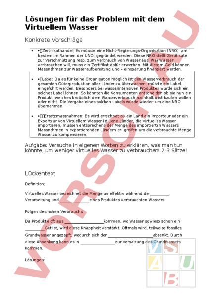Lückentext mit den wichtigen Begriffen zu "Virtuelles Wasser", Text mit Vorschlägen zu einer Reduktion von Virtuellem Wasser, Labels, Zertifikate