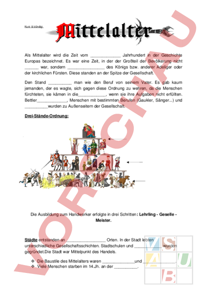Kurz bündig: Als Mittelalter wird die Zeit vom Jahrhundert in der Geschichte Europas bezeichnet. Es war eine Zeit, in der der Großteil der Bevölkerung nicht war, sondern des Königs bzw. anderer Adeliger oder der kirchlichen Fürsten. Diese standen an der Spitze der Gesellschaft. Den Stand man wie den Beruf von seinem Vater. Es gab kaum jemanden, der es wagte, sich gegen diese Ordnung zu wehren, da die Menschen fürchteten, sie kämen in die, wenn sie ihre Aufgaben nicht erfüllten. Bettler_, Menschen mit bestimmten Berufen (Gaukler, Sänger.) und wurden zu Außenseitern der Gesellschaft. DreiStändeOrdnung: Die Ausbildung zum Handwerker erfolgte in drei Schritten: Lehrling Geselle Meister. Städte entstanden an Orten. In der Stadt lebten unterschiedliche Gesellschaftsschichten. Stadtschulen und wurden gegründet.Die Stadt war Mittelpunkt des Handels. Die Baustile des Mittelalters waren und . Viele Menschen starben im 14.Jh. an der .