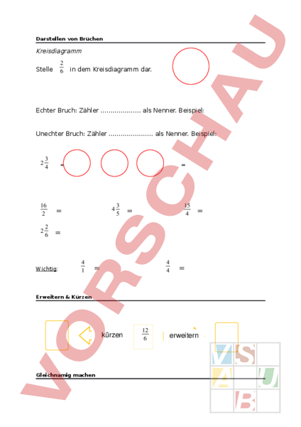 Darstellen von Brüchen Kreisdiagramm 2 6 Stelle in dem Kreisdiagramm dar. Echter Bruch: Zähler als Nenner. Beispiel: Unechter Bruch: Zähler . als Nenner. Beispiel: 2 3 4 16 2 2 6 2 Wichtig: 4 4 1 3 5 15 4 4 4 Erweitern Kürzen kürzen Gleichnamig machen 12 6 erweitern Bringe folgende Brüche auf den gleichen Nenner Der Kehrwert eines Bruches 5 10 12 50 4 2 5 6 3 9
