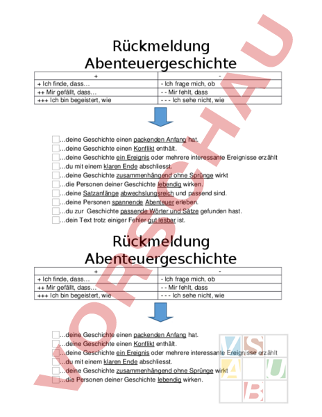 Rückmeldung Abenteuergeschichte Ich finde, dass Mir gefällt, dass Ich bin begeistert, wie Ich frage mich, ob Mir fehlt, dass Ich sehe nicht, wie deine Geschichte einen packenden Anfang hat. deine Geschichte einen Konflikt enthält. deine Geschichte ein Ereignis oder mehrere interessante Ereignisse erzählt du mit einem klaren Ende abschliesst. deine Geschichte zusammenhängend ohne Sprünge wirkt die Personen deiner Geschichte lebendig wirken. deine Satzanfänge abwechslungsreich und passend sind. deine Personen spannende Abenteuer erleben. du zur Geschichte passende Wörter und Sätze gefunden hast. dein Text trotz einiger Fehler gut lesbar ist. Rückmeldung Abenteuergeschichte Ich finde, dass Mir gefällt, dass Ich bin begeistert, wie Ich frage mich, ob Mir fehlt, dass Ich sehe nicht, wie deine Geschichte einen packenden Anfang hat. deine Geschichte einen Konflikt enthält. deine Geschichte ein Ereignis oder mehrere interessante Ereignisse erzählt du mit einem klaren Ende abschliesst. deine Geschichte zusammenhängend ohne Sprünge wirkt die Personen deiner Geschichte lebendig wirken. deine Satzanfänge abwechslungsreich und passend sind. deine Personen spannende Abenteuer erleben. du zur Geschichte passende Wörter und Sätze gefunden hast. dein Text trotz einiger Fehler gut lesbar ist.
