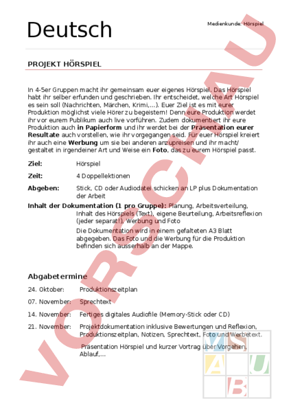 Deutsch Medienkunde: Hörspiel PROJEKT HÖRSPIEL In 4-5er Gruppen macht ihr gemeinsam euer eigenes Hörspiel. Das Hörspiel habt ihr selber erfunden und geschrieben. Ihr entscheidet, welche Art Hörspiel es sein soll (Nachrichten, Märchen, Krimi,). Euer Ziel ist es mit eurer Produktion möglichst viele Hörer zu begeistern! Denn eure Produktion werdet ihr vor eurem Publikum auch live vorführen. Zudem dokumentiert ihr eure Produktion auch in Papierform und ihr werdet bei der Präsentation eurer Resultate auch vorstellen, wie ihr vorgegangen seid. Für euer Hörspiel kreiert ihr auch eine Werbung um sie bei anderen anzupreisen und ihr macht/ gestaltet in irgendeiner Art und Weise ein Foto, das zu eurem Hörspiel passt. Ziel: Hörspiel Zeit: 4 Doppellektionen Abgeben: Stick, CD oder Audiodatei schicken an LP plus Dokumentation der Arbeit Inhalt der Dokumentation (1 pro Gruppe): Planung, Arbeitsverteilung, Inhalt des Hörspiels (Text), eigene Beurteilung, Arbeitsreflexion (jeder separat!), Werbung und Foto Die Dokumentation wird in einem gefalteten A3 Blatt abgegeben. Das Foto und die Werbung für die Produktion befinden sich ausserhalb an der Mappe. Abgabetermine 24. Oktober: Produktionszeitplan 07. November: Sprechtext 14. November: Fertiges digitales Audiofile (Memory-Stick oder CD) 21. November: Projektdokumentation inklusive Bewertungen und Reflexion, Produktionszeitplan, Notizen, Sprechtext, Foto und Werbetext. Präsentation Hörspiel und kurzer Vortrag über Vorgehen, Ablauf,