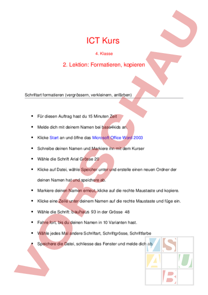 ICT Kurs 4. Klasse 2. Lektion: Formatieren, kopieren Schriftart formatieren (vergrössern, verkleinern, anfärben) Für diesen Auftrag hast du 15 Minuten Zeit Melde dich mit deinem Namen bei base4kids an. Klicke Start an und öffne das Microsoft Office Word 2003 Schreibe deinen Namen und Markiere ihn mit dem Kurser Wähle die Schrift Arial Grösse 20 Klicke auf Datei, wähle Speicher unter und erstelle einen neuen Ordner der deinen Namen hat und speichere ab. Markiere deinen Namen erneut, klicke auf die rechte Maustaste und kopiere. Klicke eine Zeile unter deinem Namen auf die rechte Maustaste und füge ein. Wähle die Schrift: bauhaus 93 in der Grösse 48 Fahre fort, bis du deinen Namen in 10 Varianten hast. Wähle jedes Mal andere Schriftart, Schriftgrösse, Schriftfarbe Speichere die Datei, schliesse das Fenster und melde dich ab.