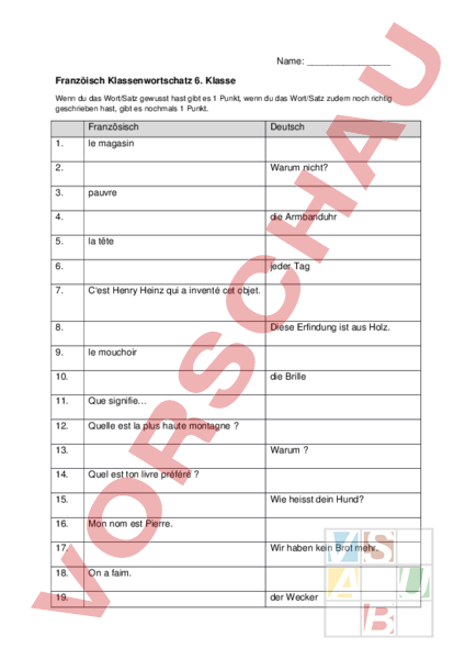 Name: Franzöisch Klassenwortschatz 6. Klasse Wenn du das Wort/Satz gewusst hast gibt es 1 Punkt, wenn du das Wort/Satz zudem noch richtig geschrieben hast, gibt es nochmals 1 Punkt. Französisch 1. le magasin 2. 3. Warum nicht? pauvre 4. 5. die Armbanduhr la tête 6. 7. jeder Tag C‘est Henry Heinz qui inventé cet objet. 8. 9. Diese Erfindung ist aus Holz. le mouchoir 10. die Brille 11. Que signifie 12. Quelle est la plus haute montagne 13. 14. Warum Quel est ton livre préféré 15. 16. Wie heisst dein Hund? Mon nom est Pierre. 17. 18. 19. Deutsch Wir haben kein Brot mehr. On faim. der Wecker 20. larbre Punkte: 40 P. Note: Prädikat: