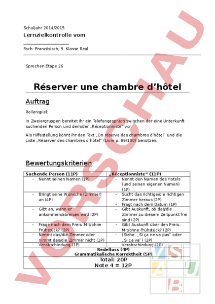 Schuljahr 2014/2015 Lernzielkontrolle vom Fach: Französisch, 9. Klasse Real Sprechen Etape 26 Réserver une chambre dhôtel Auftrag Rollenspiel: In Zweiergruppen bereitet ihr ein Telefongespräch zwischen der eine Unterkunft suchenden Person und dem/der „Réceptionniste vor. Als Hilfestellung könnt ihr den Text „On réserve des chambres dhôtel und die Liste „Réserver des chambres dhôtel (Livre p. 99/100) benützen. Bewertungskriterien Suchende Person (11P) Nennt seinen Namen (1P) „Réceptionniste (11P) Nennt den Namen des Hotels (und seinen eigenen Namen) (1P) Bringt seine Wünsche (Zimmer) Sucht das richtige/die richtigen an (4P) Zimmer heraus (2P) Fragt nach dem Datum (1P) Gibt an, wann er Gibt Auskunft, ob das/die ankommen/abreisen wird (2P) Zimmer zu diesem Zeitpunkt frei sind (2P) Frage nach dem Preis. Mit/ohne Gibt Auskunft über den Preis. Frühstück? (2P) Mit/ohne Frühstück? (2P) Nimmt das/die Zimmer oder (Siehe: „Si ça ne va pas oder nimmt das/die Zimmer nicht (1P) „Si ça va) (2P) Verabschiedung (1P) Verabschiedung (1P) Redefluss (4P) Grammatikalische Korrektheit (5P) Total: 20P Note 4 12P