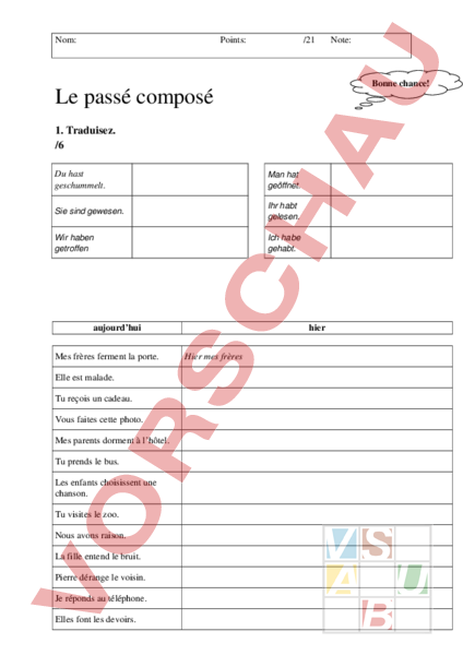 Nom: Points: /21 Bonne chance! Le passé composé 1. Traduisez. /6 Du hast geschummelt. Man hat geöffnet. Sie sind gewesen. Ihr habt gelesen. Wir haben getroffen Ich habe gehabt. aujourdhui Mes frères ferment la porte. Elle est malade. Tu reçois un cadeau. Vous faites cette photo. Mes parents dorment à lhôtel. Tu prends le bus. Les enfants choisissent une chanson. Tu visites le zoo. Nous avons raison. La fille entend le bruit. Pierre dérange le voisin. Je réponds au téléphone. Elles font les devoirs. hier Hier mes frères Note: Elle nage dans la mer. Nous parlons avec nos amis. 2. Mettez les phrases au passé composé. /15