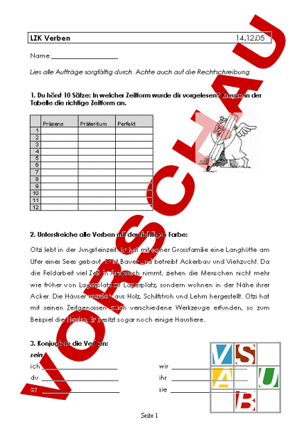 LZK Verben 14.12.05 Name:_ Lies alle Aufträge sorgfältig durch. Achte auch auf die Rechtschreibung 1. Du hörst 10 Sätze: In welcher Zeitform wurde dir vorgelesen? Kreuze in der Tabelle die richtige Zeitform an. Präsens Präteritum Perfekt 1 2 3 4 5 6 7 8 9 10 11 12 2. Unterstreiche alle Verben mit der richtigen Farbe: Ötzi lebt in der Jungsteinzeit. Er hat mit seiner Grossfamilie eine Langhütte am Ufer eines Sees gebaut. Er ist Bauer und betreibt Ackerbau und Viehzucht. Da die Feldarbeit viel Zeit in Anspruch nimmt, ziehen die Menschen nicht mehr wie früher von Lagerplatz zu Lagerplatz, sondern wohnen in der Nähe ihrer Äcker. Die Häuser werden aus Holz, Schilfstroh und Lehm hergestellt. Ötzi hat mit seinen Zeitgenossen auch verschiedene Werkzeuge erfunden, so zum Beispiel die Hacke. Er besitzt sogar noch einige Haustiere. 3. Konjugiere die Verben: sein ich wir du ihr er sie Seite 1 geben ich wir du ihr er sie 4. Setze die Verben in die richtige Form: verdienen, 3. Person Singular weinen, 2. P. Plural sein, 1. P. Sg. wohnen, 1. P. Pl. rennen, 2. P. Sg haben, 3. P. Pl. 5. Setze die Verben in die Grundform 1 und Grundform 2: Grundform 1 ich esse du schläfst er ist wir beissen ihr lest sie stehlen Seite 2 Grundform 2 6. Vervollständige die Lücken, indem du die Verben in Klammern ins Präteritum setzt: Ich (waschen) mich nicht gerne. Fast jeden Tag (streiten) ich mit meinem Bruder. Du (fallen) oft auf die Nase. Einmal (stehlen) du der Mutter einen Zwanziger. Das (geschehen) dir recht. Dann (auflesen) ich die Scherben . 7. Schreibe die Verben mit den Personalpronomen in die verlangte Zeitform: Präsens Präteritum Perfekt wir fliegen ich schrie sie ist geschwommen sie stossen es sprang ihr habt gewollt 8. In welcher Zeitform stehen die folgenden Sätze? Der Fussballer hat sich verletzt. Das Kind hatte hohes Fieber. Anna und Urs mochten sich gerne. Gehst du morgen zur Schule? Die Klasse ist im Deutsch besser geworden. Der Lehrer hat Spagetti gegessen. Erreichte Punktzahl: Maximale Punktzahl: Klassenmitte: Seite 3