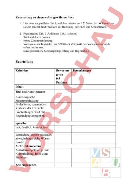 Kurzvortrag zu einem selbst gewählten Buch 1. Lies dein ausgewähltes Buch, welches mindestens 120 Seiten hat. Während des Lesens machst du dir Notizen zur Handlung, Personen und Schauplätzen. 2. Präsentation: Zeit: 35 Minuten (inkl. vorlesen) Titel und Autor nennen Kurze Zusammenfassung Vorlesen einer Textstelle (nur 59 Sätze), Zeitpunkt des Vorlesens kannst du selber bestimmen. kurze persönliche Meinung/Empfehlung und Begründung Beurteilung Kriterien Inhalt Titel und Autor genannt Kurze, logische Zusammenfassung Fehlerfreies, spannendes Vorlesen der Textstelle Empfehlungen wird mit Begründung abgegeben Sprache laut, deutlich, korrekt, frei Wortschatz: eigene passende, abwechslungsreiche Wörter benutzt Auftrittskompetenz Auftrittskompetenz: gerade Körperhaltung, Blick zum Publikum Zeit eingehalten Bewertun von 03 Punkten Bemerkungen