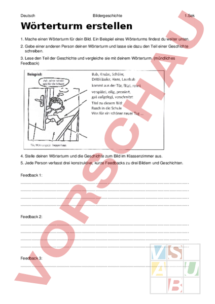 Deutsch Bildergeschichte 1.Sek Wörterturm erstellen 1. Mache einen Wörterturm für dein Bild. Ein Beispiel eines Wörterturms findest du weiter unten. 2. Gebe einer anderen Person deinen Wörterturm und lasse sie dazu den Teil einer Geschichte schreiben. 3. Lese den Teil der Geschichte und vergleiche sie mit deinem Wörterturm. (mündliches Feedback) 4. Stelle deinen Wörterturm und die Geschichte zum Bild im Klassenzimmer aus. 5. Jede Person verfasst drei konstruktive, kurze Feedbacks zu drei Bildern und Geschichten. Feedback 1: Feedback 2: Feedback 3: Deutsch Bildergeschichte 1.Sek Bildergeschichte – Text verbessern Alle Sätze haben den gleichen langweiligen Anfang. Durch die Umstellprobe kannst du sie verändern! Oft sind es nichtssagende Verben (machen usw.) Durch die Ersatzprobe kannst du bessere Verben suchen! Du kannst aber auch einfach vorgegebene Sätze zusammenziehen oder ganz weglassen. Natürlich kannst du auch neue Sätze einfügen. Am Schluss soll es ein interessanter zusammenhängender Text sein. Schreibe deinen eigenen Text in dein Deutschheft. Frühjahrsmüdigkeit (Titel des Autors) Deutsch Bildergeschichte 1.Sek