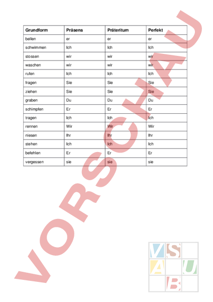 Grundform Präsens Präteritum Perfekt bellen er er er schwimmen Ich Ich Ich stossen wir wir wir waschen wir wir wir rufen Ich Ich Ich fragen Sie Sie Sie ziehen Sie Sie Sie graben Du Du Du schimpfen Er Er Er tragen Ich Ich Ich rennen Wir Wir Wir niesen Ihr Ihr Ihr stehen Ich Ich Ich befehlen Er Er Er vergessen sie sie sie