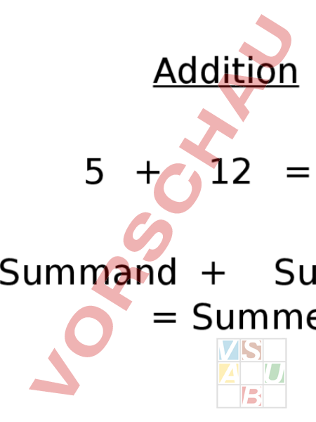 Addition 5 12 17 Summand Summand Summe Subtraktion 12 5 7 Minuend Subtrahend Differenz Multiplikation 5 12 60 Faktor Faktor Produkt Division 20 5 4 Dividend Divisor Quotient