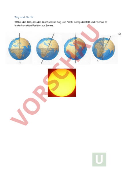 Tag und Nacht Wähle das Bild, das den Wechsel von Tag und Nacht richtig darstellt und zeichne es in der korrekten Position zur Sonne. D C Tag und Nacht Wähle das Bild, das den Wechsel von Tag und Nacht richtig darstellt und zeichne es in der korrekten Position zur Sonne.