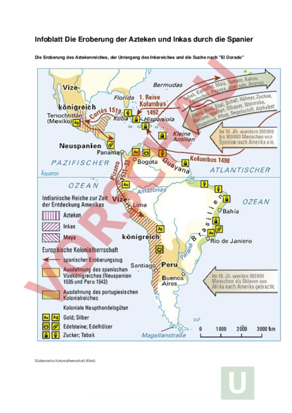 Infoblatt Die Eroberung der Azteken und Inkas durch die Spanier Die Eroberung des Aztekenreiches, der Untergang des Inkareiches und die Suche nach El Dorado Südamerika Kolonialherrschaft (Klett) Die Aufteilung der Welt Spanier und Portugiesen hatten sich 1494 im Vertrag von Tordesillas vom Papst Alexander VI. die Welt aufteilen lassen. Während die Portugiesen sich mit einigen Stützpunkten begnügten, die ihren Seeweg nach Indien sicherten, strebten die Spanier nach Landbesitz. Deshalb nahmen sie ganz Mittel und Südamerika – außer Brasilien – für sich in Besitz. Mit der Landeroberung folgte die Ausplünderung der unterworfenen Regionen und Stämme. Die Neue Welt wurde zur Silberprovinz des spanischen Staates, der mit den Schätzen der unterworfenen Völker seine Kassen füllte und immer neue Expeditionen ausrüstete. Die besiegten Indianer wurden beraubt und versklavt. Als Zwangsarbeiter mussten sie in Bergwerken und Goldwäschereien für die spanischen Eroberer arbeiten. Im sog. EncomiendaSystem wurden den Eroberern und ihren Nachfahren neben den Ländereien auch Indianer als Arbeitskräfte zugeteilt, die diese bewirtschafteten. Diese Art der Leibeigenschaft der Landarbeiter war die Grundlage für den wirtschaftlichen Erfolg der Großgrundbesitzungen, die sich als Latifundien bis heute erhalten haben. Dabei hatte die spanische Königin Isabella bereits 1503 ein Gesetz erlassen, das die grausame Behandlung der Indianer verbot. Auch die spanischen Missionare protestierten gegen die Gräueltaten, die im Namen der spanischen Krone begangen wurden. In langen Verhandlungen und Bemühungen um das Wohlergehen wurde die Fürsorge der Geistlichen schließlich belohnt. Die Eingeborenen durften nicht mehr versklavt werden, sondern galten als unmündige Schutzbefohlene. Als solche wurden sie in Missionsdörfern von Geistlichen zu Christen und spanischen Untertanen erzogen. Zusammen mit der spanischen Kolonialverwaltung gelang es der christlichen Mission, einen ganzen Erdteil zum Christentum zu bekehren und Millionen von Indianer an das europäische Leben heranzuführen. Eroberung des Aztekenreiches Das Reich der Azteken lag im Bereich des heutigen Mexikos und dehnte sich zwischen der Östlichen und der Südlichen Sierra Madre vom Golf von Mexiko bis zum Pazifik aus. Hauptort war Tenochtitlan (dunkelrote Signatur), das heutige Mexiko City. Die Azteken beherrschten die Stämme der Region und erregten mit ihren Straßenanlagen und riesigen Tempelbauten das Erstaunen der Spanier. Die Azteken hatten umfangreiche Bewässerungsanlagen für ihre Felder entwickelt, auf denen Mais, Tomaten, Tabak und Kakao gediehen. Sie konnten kunstvolle Waffen und Geräte aus Gold und Kupfer herstellen, kannten aber kein Eisen. Das Töpferhandwerk war fortgeschritten, kannte aber noch keine Töpferscheibe. Die Azteken verfügten über einen präzisen Kalender und über ein Gesellschaftssystem mit Schulpflicht und militärischer Grundausbildung. An der Spitze des aztekischen Reiches stand der Tlacatecuhtli als oberster Herrscher. Er regierte in Tenochtitlan, der größten Stadt mit über 300.000 Einwohnern. Die gewaltige Stadtanlage lag auf einer Insel, die nur über drei Dämme mit dem Festland verbunden war. Tenochtitlan war in Wohnviertel eingeteilt, besaß mehrere Marktplätze sowie Parkanlagen und hatte im Zentrum einen Tempelbereich. Die Eroberung und Zerstörung des Aztekenreiches ist untrennbar mit dem Namen Hernán Cortés verbunden, der als Adliger sein Glück in der neuen Welt machen wollte. In Anlehnung an die Reconquista, die Rückeroberung Spaniens von den muslimischen Mauren im 15. Jahrhundert nannten sich die spanischen Eroberer Conquistadoren (Eroberer). Dabei spielte einerseits der Wunsch der Christianisierung mit, andererseits der Vorbildcharakter der spanischen Adligen, die die Heimat befreit hatten. Von Kuba aus startete er seine Eroberung mit 600 freiwilligen Teilnehmern, die er in ihrer Gier nach Macht und Gold mühelos anwerben konnte. Zunächst erkundete er die Küste und bereitete seinen Marsch ins Landesinnere vor. Um seine Männer an einer Umkehr zu hindern, ließ er die Schiffe verbrennen und zog mit 14 Kanonen und 16 Pferden ins Hochland von Mexiko. Unterwegs verbündete er sich mit einigen Stämmen, die immer wieder von den Azteken überfallen worden waren. Montezuma, mächtiger Herrscher der Azteken, hörte von den Eindringlingen, die mit ihren Kanonen und Pferden überall Schrecken und Angst verbreiteten. Man hielt die Spanier für Götter, was die Azteken einschüchterte. Montezuma schickte eine Gesandtschaft mit Geschenken, um Cortés von einem weiteren Vordringen abzuhalten, erreichte aber genau das Gegenteil. Beflügelt von dem Glanz der Geschenke zogen die Spanier weiter in Richtung Tenochtitlan. Cortés überzeugte Montezuma von seinen friedlichen Absichten, so dass die Azteken sogar die Spanier in die Hauptstadt führten und im Palast unterbrachten. Montezuma wurde zur Geisel der Spanier. Als die Spanier gegen die einheimischen Götzendienste und Tempel vorgingen, erhoben sich die Azteken. Montezumas Volk verdächtigte seinen Herrscher der Zusammenarbeit mit den Spaniern und steinigte ihn beim Versuch, im Auftrag der Spanier mit ihm zu verhandeln. So starb der letzte Herrscher der Azteken. Die Spanier mussten sich aus der Hauptstadt zurückziehen, belagerten aber die Dämme und verhinderten die Versorgung. 1521 fiel Tenochtitlan nach 107 Tagen Belagerung durch die mit weiteren Truppen verstärkten Spanier, die riesengroße Stadt ging in Flammen auf. Die Kultur der Azteken wurde vollständig vernichtet. Cortés ließ die Stadt zwei Jahre später wieder aufbauen und nahm das Land unter spanische Verwaltung. Der Untergang des Inkareiches Das Reich der Inka dehnte sich im Hochland der Anden an der Pazifikküste über mehr als 4.000 km von der Nordgrenze Ecuadors (Quito), die westlichen Landesteile von Peru und Bolivien bis zum heutigen Santiago de Chile im Süden aus. Die Hauptsta