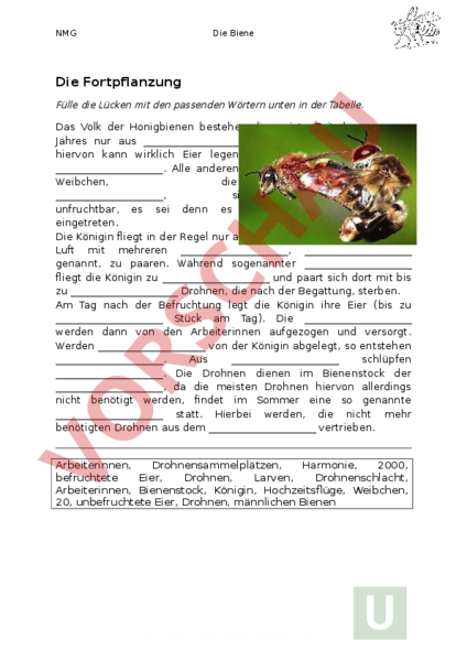 Arbeitsblatt: Fortpflanzung der Biene