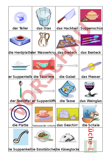 der Teller das Glas das Hackbeil die Suppenschüssel die Herdplatteder Wasserkrug das Gedeck der Suppentellerdie Sauciere das Besteck die Gabel der Teelöffelder Suppenlöffel die Tasse das Messer das Weinglas die Suppenkelle die Essstäbchen die Käseglocke die Schale Küche 1 die Plattedie Teetasse/der Unterteller das Geschirr die Suppenschüssel