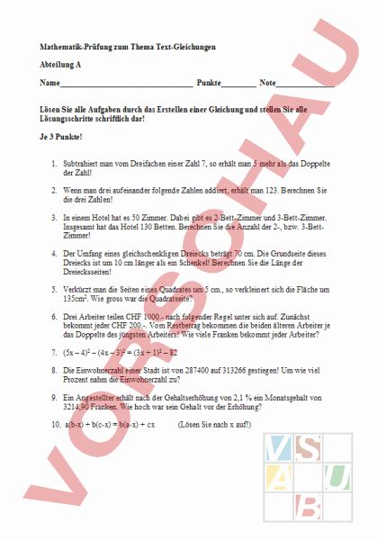 Mathematik-Prüfung zum Thema Text-Gleichungen Abteilung Name Punkte_ Note_ Lösen Sie alle Aufgaben durch das Erstellen einer Gleichung und stellen Sie alle Lösungsschritte schriftlich dar! Je 3 Punkte! 1. Subtrahiert man vom Dreifachen einer Zahl 7, so erhält man 5 mehr als das Doppelte der Zahl! 2. Wenn man drei aufeinander folgende Zahlen addiert, erhält man 123. Berechnen Sie die drei Zahlen! 3. In einem Hotel hat es 50 Zimmer. Dabei gibt es 2-Bett-Zimmer und 3-Bett-Zimmer. Insgesamt hat das Hotel 130 Betten. Berechnen Sie die Anzahl der 2-, bzw. 3-BettZimmer! 4. Der Umfang eines gleichschenkligen Dreiecks beträgt 70 cm. Die Grundseite dieses Dreiecks ist um 10 cm länger als ein Schenkel! Berechnen Sie die Länge der Dreiecksseiten! 5. Verkürzt man die Seiten eines Quadrates um 5 cm., so verkleinert sich die Fläche um 135cm2. Wie gross war die Quadratseite? 6. Drei Arbeiter teilen CHF 1000.- nach folgender Regel unter sich auf. Zunächst bekommt jeder CHF 200.-. Vom Restbetrag bekommen die beiden älteren Arbeiter je das Doppelte des jüngsten Arbeiters! Wie viele Franken bekommt jeder Arbeiter? 7. (5x – 4)2 – (4x – 3)2 (3x 1)2 – 82 8. Die Einwohnerzahl einer Stadt ist von 287400 auf 313266 gestiegen! Um wie viel Prozent nahm die Einwohnerzahl zu? 9. Ein Angestellter erhält nach der Gehaltserhöhung von 2,1 ein Monatsgehalt von 3214,90 Franken. Wie hoch war sein Gehalt vor der Erhöhung? 10. a(b-x) b(c-x) b(a-x) cx (Lösen Sie nach auf!) Mathematik-Prüfung zum Thema Text-Gleichungen Abteilung Name Punkte_ Note_ Lösen Sie alle Aufgaben durch das Erstellen einer Gleichung und stellen Sie alle Lösungsschritte schriftlich dar! Je 3 Punkte! 1. Subtrahiert man vom Vierfachen einer Zahl 8, so erhält man 6 mehr als das Dreifache der Zahl! 2. Wenn man drei aufeinander folgende Zahlen addiert, erhält man 93. Berechnen Sie die drei Zahlen! 3. In einem Hotel hat es 100 Zimmer. Dabei gibt es 2-Bett-Zimmer und 4-Bett-Zimmer. Insgesamt hat das Hotel 246 Betten. Berechnen Sie die Anzahl der 2-, bzw. 4-BettZimmer! 4. Der Umfang eines gleichschenkligen Dreiecks beträgt 105 cm. Die Grundseite dieses Dreiecks ist ein Drittel so lange wie ein Schenkel! Berechnen Sie die Länge der Dreiecksseiten! 5. Verlängert man die Seiten eines Quadrates um 5 cm., so vergrössert sich die Fläche um 135cm2. Wie gross war die Quadratseite? 6. Drei Arbeiter teilen CHF 1000.- nach folgender Regel unter sich auf. Zunächst bekommt jeder CHF 200.-. Vom Restbetrag bekommen die beiden älteren Arbeiter je das Doppelte des jüngsten Arbeiters! Wie viele Franken bekommt jeder Arbeiter? 7. (5x – 4)2 – (4x – 3)2 (3x 1)2 – 82 8. Die Einwohnerzahl einer Stadt ist von 287400 auf 313266 gestiegen! Um wie viel Prozent nahm die Einwohnerzahl zu? 9. Ein Angestellter erhält nach der Gehaltserhöhung von 2,1 ein Monatsgehalt von 3214,90 Franken. Wie hoch war sein Gehalt vor der Erhöhung? 10. v(u-x) wx u(v-x) v(w-x) (Lösen Sie nach auf!)
