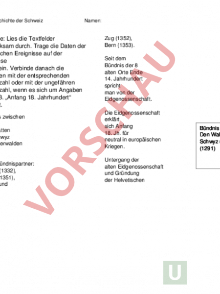 Die Geschichte der Schweiz Namen: Aufgabe: Lies die Textfelder aufmerksam durch. Trage die Daten der historischen Ereignisse auf der Zeitachse richtig ein. Verbinde danach die Kästchen mit der entsprechenden Jahreszahl oder mit der ungefähren Jahreszahl, wenn es sich um Angaben wie z. B. „Anfang 18. Jahrhundert handelt. Bündnis zwischen den Waldstätten Uri, Schwyz und Unterwalden (1291) Neue Bündnispartner: Luzern (1332), Zürich (1351), Glarus und Zug (1352), Bern (1353). Seit dem Bündnis der 8 alten Orte Ende 14. Jahrhundert spricht man von der Eidgenossenschaft. Die Eidgenossenschaft erklärt sich Anfang 18. Jh. für neutral in europäischen Kriegen. Untergang der alten Eidgenossenschaft und Gründung der Helvetischen Republik durch Napoleon (1798) Nach erneuten Kriegen zwischen den Anhängern der alten Eidgenossenschaft und der Helvetischen Republik wird 1815 die Schweizerische Eidgenossenschaft gegründet. Bündnis zwischen Den Waldstätten Uri, des Schwyz undGründung Unterwalden freien Bundesstaates (1291) 1848 Die demokratische Schweiz in der Gegenwart