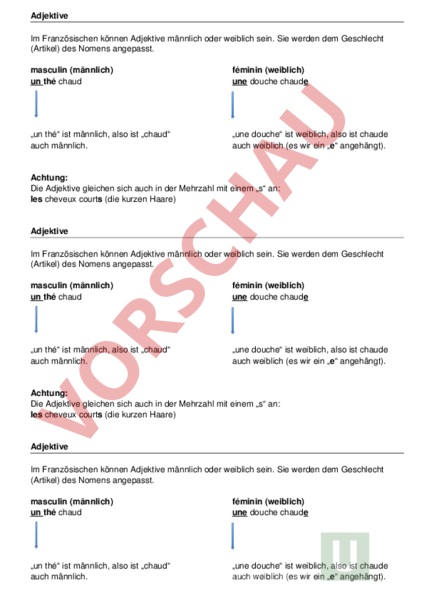 Adjektive Im Französischen können Adjektive männlich oder weiblich sein. Sie werden dem Geschlecht (Artikel) des Nomens angepasst. masculin (männlich) un thé chaud féminin (weiblich) une douche chaude „un thé ist männlich, also ist „chaud auch männlich. „une douche ist weiblich, also ist chaude auch weiblich (es wir ein „e angehängt). Achtung: Die Adjektive gleichen sich auch in der Mehrzahl mit einem „s an: les cheveux courts (die kurzen Haare) Adjektive Im Französischen können Adjektive männlich oder weiblich sein. Sie werden dem Geschlecht (Artikel) des Nomens angepasst. masculin (männlich) un thé chaud féminin (weiblich) une douche chaude „un thé ist männlich, also ist „chaud auch männlich. „une douche ist weiblich, also ist chaude auch weiblich (es wir ein „e angehängt). Achtung: Die Adjektive gleichen sich auch in der Mehrzahl mit einem „s an: les cheveux courts (die kurzen Haare) Adjektive Im Französischen können Adjektive männlich oder weiblich sein. Sie werden dem Geschlecht (Artikel) des Nomens angepasst. masculin (männlich) un thé chaud féminin (weiblich) une douche chaude „un thé ist männlich, also ist „chaud auch männlich. „une douche ist weiblich, also ist chaude auch weiblich (es wir ein „e angehängt). Achtung: Die Adjektive gleichen sich auch in der Mehrzahl mit einem „s an: les cheveux courts (die kurzen Haare)