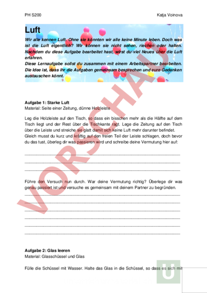 PH S200 Katja Voinova Luft Wir alle kennen Luft. Ohne sie könnten wir alle keine Minute leben. Doch was ist die Luft eigentlich? Wir können sie nicht sehen, riechen oder halten. Nachdem du diese Aufgabe bearbeitet hast, wirst du viel Neues über die Luft erfahren. Diese Lernaufgabe sollst du zusammen mit einem Arbeitspartner bearbeiten. Die Idee ist, dass ihr die Aufgaben gemeinsam besprechen und eure Gedanken austauschen könnt. Aufgabe 1: Starke Luft Material: Seite einer Zeitung, dünne Holzleiste Leg die Holzleiste auf den Tisch, so dass ein bisschen mehr als die Hälfte auf dem Tisch liegt und der Rest über die Tischkante ragt. Lege die Zeitung auf den Tisch über die Leiste und streiche sie glatt damit sich keine Luft mehr darunter befindet. Gleich musst du kurz und kräftig auf den freien Teil der Leiste schlagen, doch bevor du das tust, überleg dir was passieren wird und schreibe deine Vermutung hier auf: Führe den Versuch nun durch. War deine Vermutung richtig? Überlege dir was genau passiert ist und versuche es gemeinsam mit deinem Partner zu begründen. Aufgabe 2: Glas leeren Material: Glasschüssel und Glas Fülle die Schüssel mit Wasser. Halte das Glas in die Schüssel, so dass es sich mit PH S200 Katja Voinova Wasser füllen kann. Wenn es voll ist stellst du es auf dem Boden der Schüssel ab. Deine Aufgabe ist es nun das Wasser aus dem Glas herauszubringen, ohne es dabei aus der Schüssel zu nehmen. Macht euch zuerst Gedanken zum Vorgehen und macht Notizen. Erstellt falls möglich eine Skizze. Falls ihr weitere Materialien benötigt, könnt ihr sie bei der Lehrperson holen. Wenn ihr nicht weiterkommt, könnt ihr eure Ideen mit anderen Gruppen in einem stillen Dialog austauschen und versuchen zu viert einen Weg zu finden die Aufgabe zu lösen. Nehmt dazu ein liniertes Blatt Papier und benutzt unterschiedliche Farben. Wenn ihr eine Lösung gefunden habt die funktioniert, formuliert einen Merksatz: Aufgabe 3: Kalte Luft, warme Luft Material: verschliessbare Plastikflasche, Glasflasche, heisses Wasser, kalte Glasflasche aus dem Gefrierfach, Eiswürfeln, Schüsseln, Luftballons a) Fülle heisses Wasser in eine Plastikflasche und kippe es nach einigen Sekunden wieder aus. Verschliesse die Flasche. Halte die Flasche in kaltes Wasser. Was passiert? PH S200 Katja Voinova Deine Aufgabe ist es nun, mit Hilfe der vorherigen Beobachtungen, einen Luftballon in die Flasche hineinzubringen. (Du darfst ihn nicht einfach reinstecken). Macht euch wieder zuerst Gedanken zum Vorgang und macht dazu Notizen. Arbeite mit den Glasflaschen. Wenn ihr nicht weiterkommt, könnt ihr eure Ideen mit anderen Gruppen in einem stillen Dialog austauschen und versuchen zu viert einen Weg zu finden die Aufgabe zu lösen. Nehmt dazu ein liniertes Blatt Papier und benutzt unterschiedliche Farben. Wenn ihr eine Lösung gefunden habt die funktioniert, formuliert einen Merksatz: b) Jetzt musst du versuchen, den Ballon nur mit Hilfe der obengenannten Hilfsmittel aufzublasen. Formuliert wieder eine Vermutung und probiert sie aus. Macht auch hier wieder eine Zeichnung, die ihr auch beschriftet. Formuliert auch hier wieder einen Merksatz: PH S200 Katja Voinova Lösungen Aufgabe 1: Wenn man richtig draufschlägt, wird die Leiste zerbrechen da sie von der Zeitung festgehalten wird. Es genügt auch so auf die Leiste zu schlagen, dass sie nicht zerbricht um den Luftwiderstand trotzdem zu spüren. Wie jeder andere Körper auch, hat die Luft eine Masse. Wäre dem nicht so, würde sie nicht von der Erdanziehung gehalten werden, sondern im Weltall verschwinden. Diese Masse drückt „Luftdruck) auf die Erde bzw. auf uns und zwar so fest, dass das einem Kilogramm pro Quadratzentimeter Fläche entspricht. Wir nehmen das nur deshalb nicht wahr, weil wir – und alle anderen Lebewesen auch – uns daran gewöhnt haben. Eine Zeitungsseite kann leicht einige tausend Quadratzentimeter Fläche aufweisen, entsprechend hoch ist der Druck, den die Luft darauf ausübt. Da wir die Zeitung glattgestrichen haben, befindet sich die Luft nur noch über, aber nicht mehr unter der Zeitungsseite, womit der (Luft)Druck lediglich von oben ausgeübt wird. Schlägt man nun schnell genug auf die Leiste, drücken Zeitung (leicht!) und Luft (schwer!) gemeinsam die Leiste nach unten, als hätte man einen Amboss daraufgestellt. Die Masse der Zeitung ist allerdings viel zu gering, um eine entscheidende Rolle zu spielen. Das Entscheidende ist die Masse der Luft. (Das kannst du testen, indem du die Zeitung zusammengefaltet oder zerknüllt auf das Brett legst und dann darauf schlägst.) Schlägt man zu vorsichtig, dann gelangt auch unter die Zeitung etwas Luft und hebt den Effekt auf, denn dann herrscht unter wie über der Zeitung der gleiche Luftdruck. Jetzt drückt nur noch die Masse der Zeitung, die natürlich viel zu klein ist, die Leiste zu halten. Aufgabe 2: Unter das mit Wasser gefüllte Glas wird ein Strohhalm geschoben. Danach bläst man Luft ins Glas rein. Man kann von aussen zusehen, wie die Luft das Wasser im Glas verdrängt. Es wirken hier zwei Kräfte, die Erdanziehung und der Auftrieb. Der Auftrieb wirkt der Erdanziehung genau entgegen. Luft und Wasser werden beide von der Erde angezogen. Da aber Luft leichter als Wasser ist, erfährt sie im Wasser einen Auftrieb, eine Kraft, die in diesem Fall stärker auf die Luft einwirkt als die Erdanziehung. Somit bewegt sich Luft innerhalb des Wassers nicht nach unten (zur Erde) und fällt wieder aus dem Glas heraus, sondern blubbert innerhalb des Glases nach oben. Dadurch kann sich das Glas mit Luft füllen. Die hinein gepustete Luft drückt das Wasser nach unten aus dem Glas, bis sich nur noch Luft und kein Wasser mehr darin befindet. Denn im Glas ist kein Platz für beides: Das Glas kann nicht voll Wasser und gleichzeitig voll Luft sein! Aufgabe 3: a) Die Plastikflasche wird zusammengedrückt, da die kalte Luft im Inneren weniger Platz braucht. Der Ballon wird über die warme Glasflasche gestülp