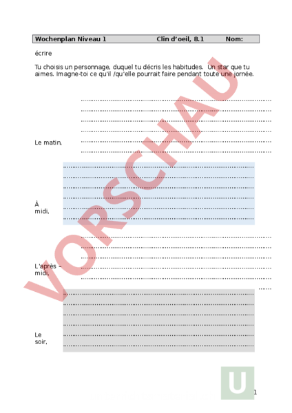 Wochenplan Niveau 1 Clin doeil, 8.1 Nom: écrire Tu choisis un personnage, duquel tu décris les habitudes. Un star que tu aimes. Imagne-toi ce quil /quelle pourrait faire pendant toute une jornée. Le matin, À midi, Laprès – midi, Le soir, 1 Bewertung Texte korrekt schreiben - Du beschreibst viele verschiedene Tätigkeiten. Deine Aussagen sind nachvollziehbar. Dein Text ist als Tagesablauf gegliedert. Die Satzanfänge sind abwechslungsreich. Du verwendest die Verben mit se(verbes pronominaux) richtig. Du brauchst verschiedene Füllwörter. (ensuite, après, parfois.) Dein Text beschreibt jeden Tagesabschnitt mit mehreren Aussagen (mind.3). 2 Ein anderer Star 3 4