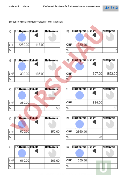 Mathematik 1. Klasse Kaufen und Bezahlen: 5a Preise Aktionen Mehrwertsteuer Ue 5a.3 Berechne die fehlenden Werten in den Tabellen. a) CHF Bruttopreis Rabatt 2260.00 Nettopreis 113.00 CHF CHF Bruttopreis Rabatt 300.00 Nettopreis 135.00 CHF CHF Bruttopreis Rabatt Nettopreis 350.00 CHF d) Bruttopreis Rabatt Nettopreis 327.00 50 Bruttopreis Rabatt 500.00 f) Bruttopreis Rabatt 1853.00 Nettopreis 350.00 60 h) CHF Bruttopreis Rabatt 610.00 Nettopreis 366.00 k) CHF Nettopreis 2350.00 25 Bruttopreis Rabatt Nettopreis 864.00 CHF i) 85 g) Nettopreis 930.00 CHF e) Bruttopreis Rabatt c) b) Bruttopreis Rabatt Nettopreis 830.00 60