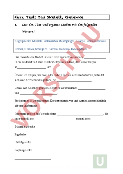Arbeitsblatt: Kurztest Knochen, Gelenke