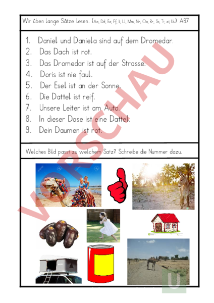 Wir üben lange Sätze lesen. (Aa, Dd, Ee, Ff, Ii, Ll, Mm, Nn, Oo, Rr, Ss, Tt, ei, Uu) AB7 1. 2. 3. 4. 5. 6. 7. 8. 9. Daniel und Daniela sind auf dem Dromedar. Das Dach ist rot. Das Dromedar ist auf der Strasse. Doris ist nie faul. Der Esel ist an der Sonne. Die Dattel ist reif. Unsere Leiter ist am Auto. In dieser Dose ist eine Dattel. Dein Daumen ist rot. Welches Bild passt zu welchem Satz? Schreibe die Nummer dazu.