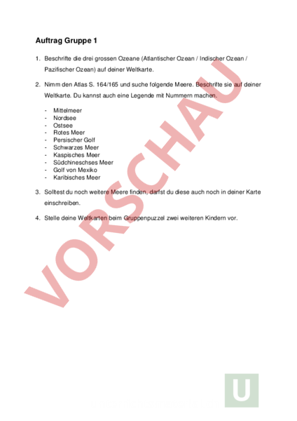 Auftrag Gruppe 1 1. Beschrifte die drei grossen Ozeane (Atlantischer Ozean Indischer Ozean Pazifischer Ozean) auf deiner Weltkarte. 2. Nimm den Atlas S. 164/165 und suche folgende Meere. Beschrifte sie auf deiner Weltkarte. Du kannst auch eine Legende mit Nummern machen. Mittelmeer Nordsee Ostsee Rotes Meer Persischer Golf Schwarzes Meer Kaspisches Meer Südchineschses Meer Golf von Mexiko Karibisches Meer 3. Solltest du noch weitere Meere finden, darfst du diese auch noch in deiner Karte einschreiben. 4. Stelle deine Weltkarten beim Gruppenpuzzel zwei weiteren Kindern vor. Auftrag Gruppe 2 1. Beschrifte die drei grossen Ozeane (Atlantischer Ozean Indischer Ozean Pazifischer Ozean) auf deiner Weltkarte. 2. Nimm den Atlas und suche folgende sechs Flüsse auf der Weltkarte. Arbeite mit dem Register ganz hinten im Atlas. Zeichne die Seen auf deiner Weltkarte ein. Du kannst auch eine Legende mit Nummern machen. Sechs Flüsse der Welt: 1. Amazonas (6992 km) 2. Der Nil (6671 km) 3. Jagtsekiang (6276 km) 4. Missouri River (3767 km) 5. Wolga (3530 km) 6. Murray River (2508 km) 3. Was fällt dir auf, wenn du nun deine Weltkarte anschaust? 4. Stelle deine Weltkarten beim Gruppenpuzzel zwei weiteren Kindern vor. Auftrag Gruppe 3 1. Beschrifte die drei grossen Ozeane (Atlantischer Ozean Indischer Ozean Pazifischer Ozean) auf deiner Weltkarte. 2. Nimm den Atlas und suche folgende sechs Seen. Arbeitet mit dem Register ganz hinten im Atlas. Zeichne sie auf deiner Weltkarte ein. Du kannst auch eine Legende mit Nummern machen. Sechs Seen der Welt: 1. Victoriasee (68800 km2) 2. Ladogasee (18 00 km2) 3. Baikalsee (31492 km2) 4. Oberer See (82414 km2) 5. MaracaiboSee (13 00 km2) 6. Lake Eyre (9876 km2) 3. Was fällt dir auf, wenn du nun deine Weltkarte anschaust? 4. Stelle deine Weltkarten beim Gruppenpuzzel zwei weiteren Kindern vor.